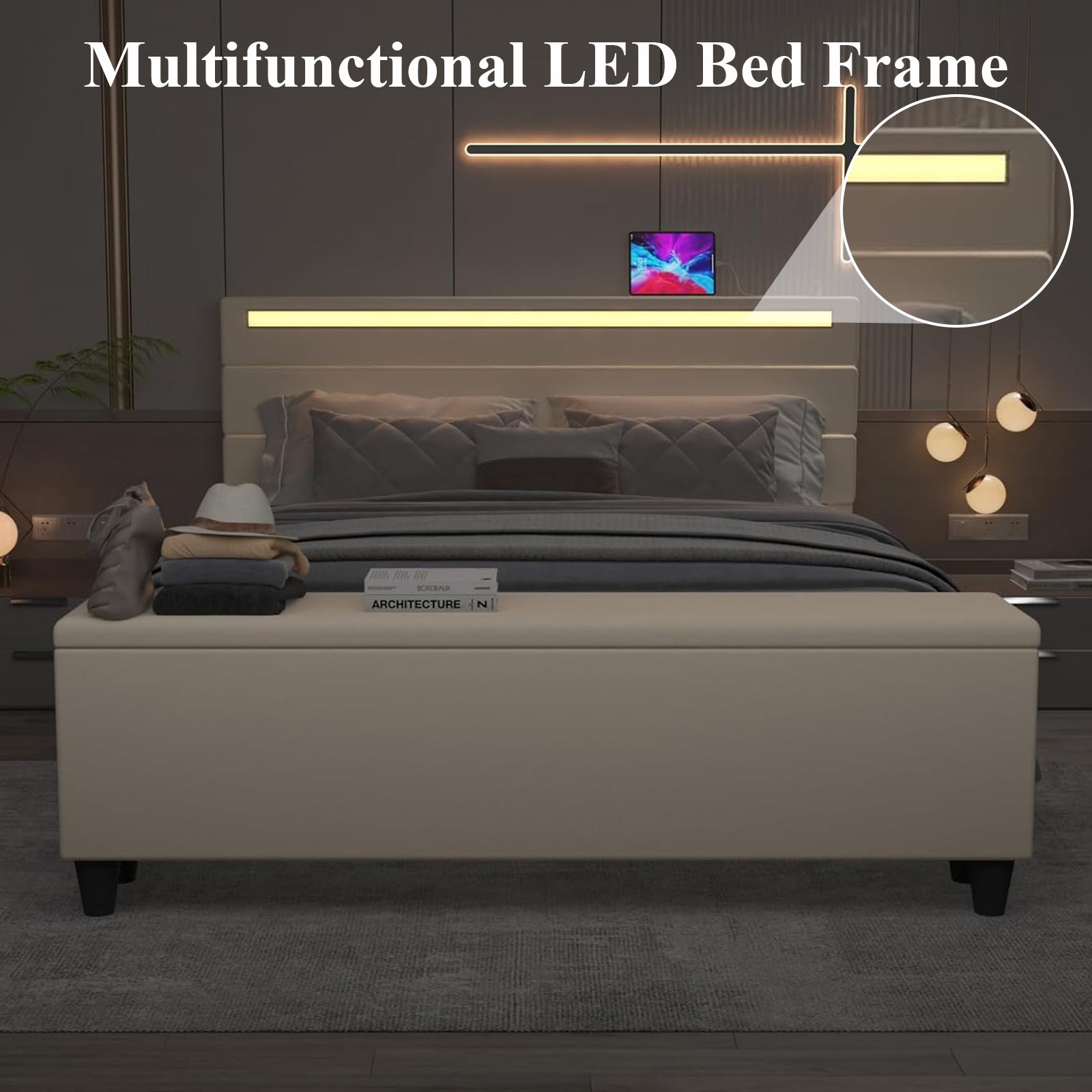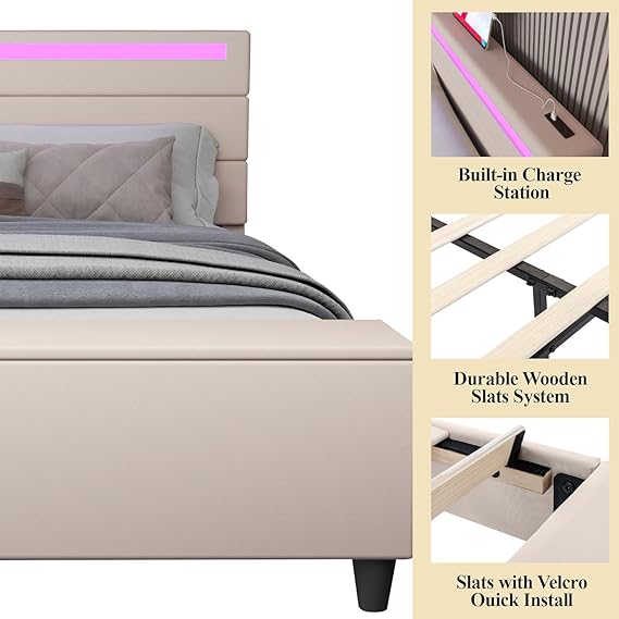 【LED Bed Frame with USB Ports】This linen bed frame with 2 USB ports allows you to easily charge your mobile phones, tablets, headphones and other electronic devices while lying in bed. The headboard is equipped with RGB LED light strips. You can use the mobile phone APP to set the color, brightness, mode, timing function, etc. of the LED to meet the needs of different styles and different scenes, making your home life more colorful. The LED function comes with detailed instructions, and you can complete the corresponding settings according to the instructions.