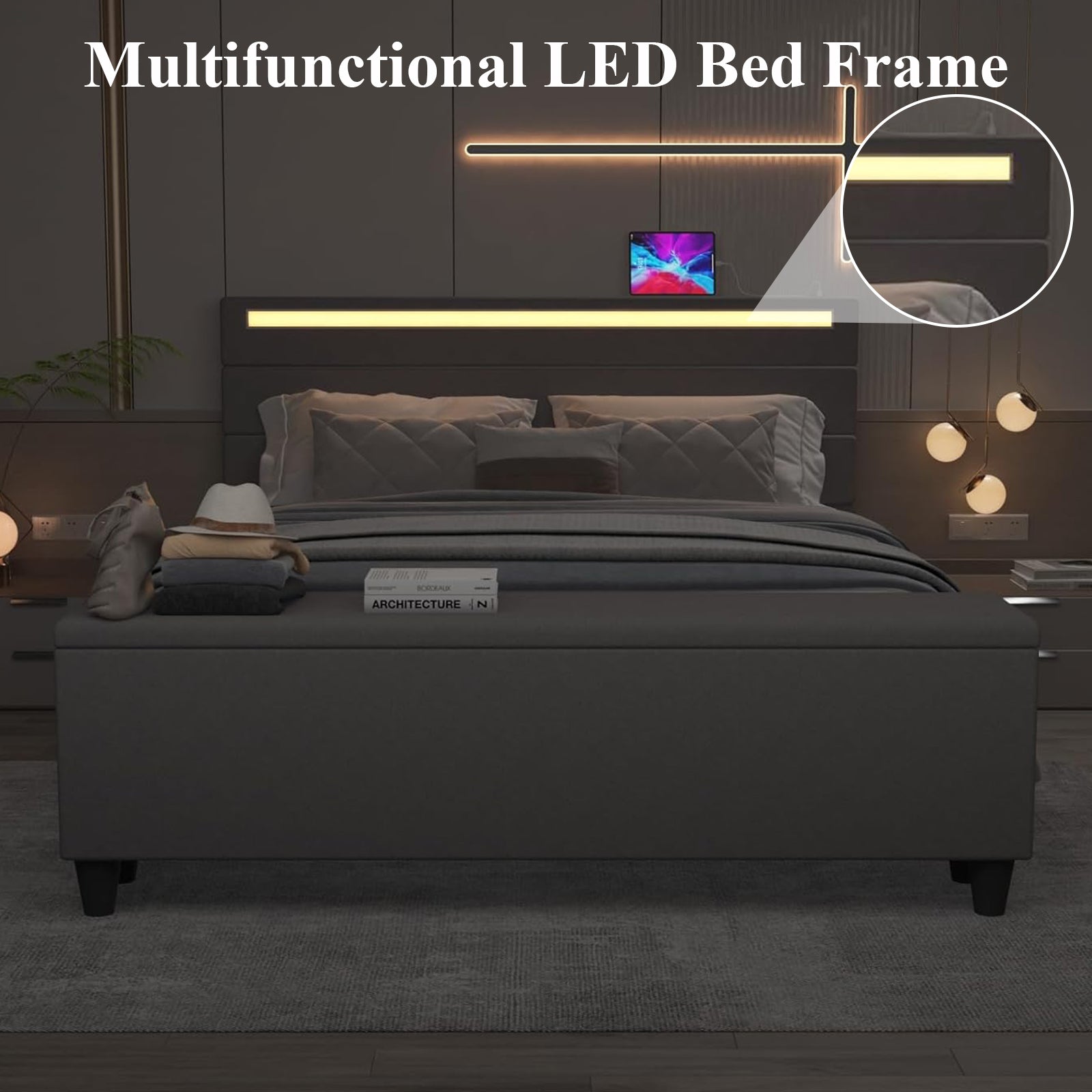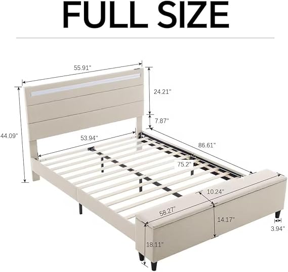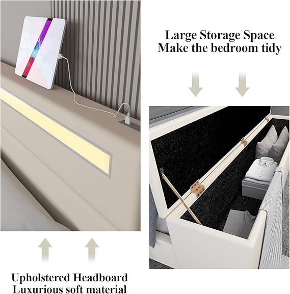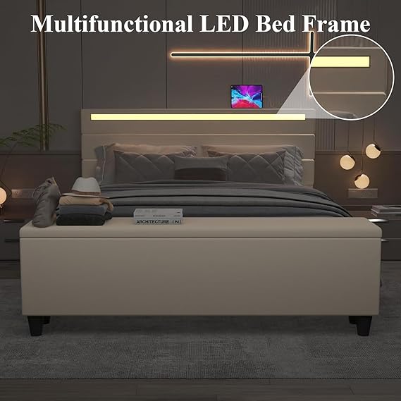 【Maximize Your Space】The bed frame with USB charging port is equipped with a storage box at the end of the bed. Compared with ordinary bed footboards, it not only increases the length of the bed frame, but also allows you to put some clothes or books on it when you need them at any time, and you can also sit on it to rest, avoiding messing up the sheets and quilts; the box provides you with enough space to store extra sheets, pillows, clothes and other sundries. It can keep the room tidy. It is especially suitable for small bedrooms or apartments with limited storage space.