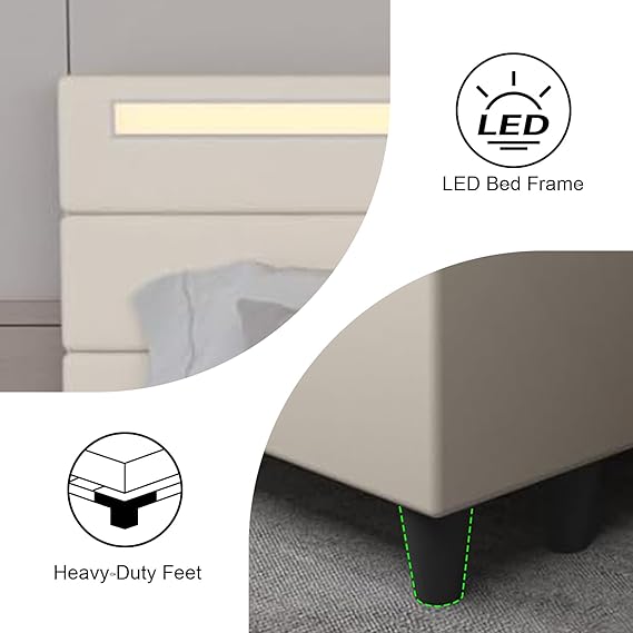 【Upholstered Bed Frame】The surface of this bed frame with LED lights is made of high-quality linen fabric, which is very skin-friendly. When you touch the fabric with your fingers, you will find that it is so soft and comfortable. The high-resilience sponge of the headboard is thicker, allowing you to enjoy a more comfortable and relaxing time when sitting on the bed reading or watching TV. It is a good choice to enhance your bedroom with elegant aesthetics, whether it is to enhance your master bedroom or a stylish guest room