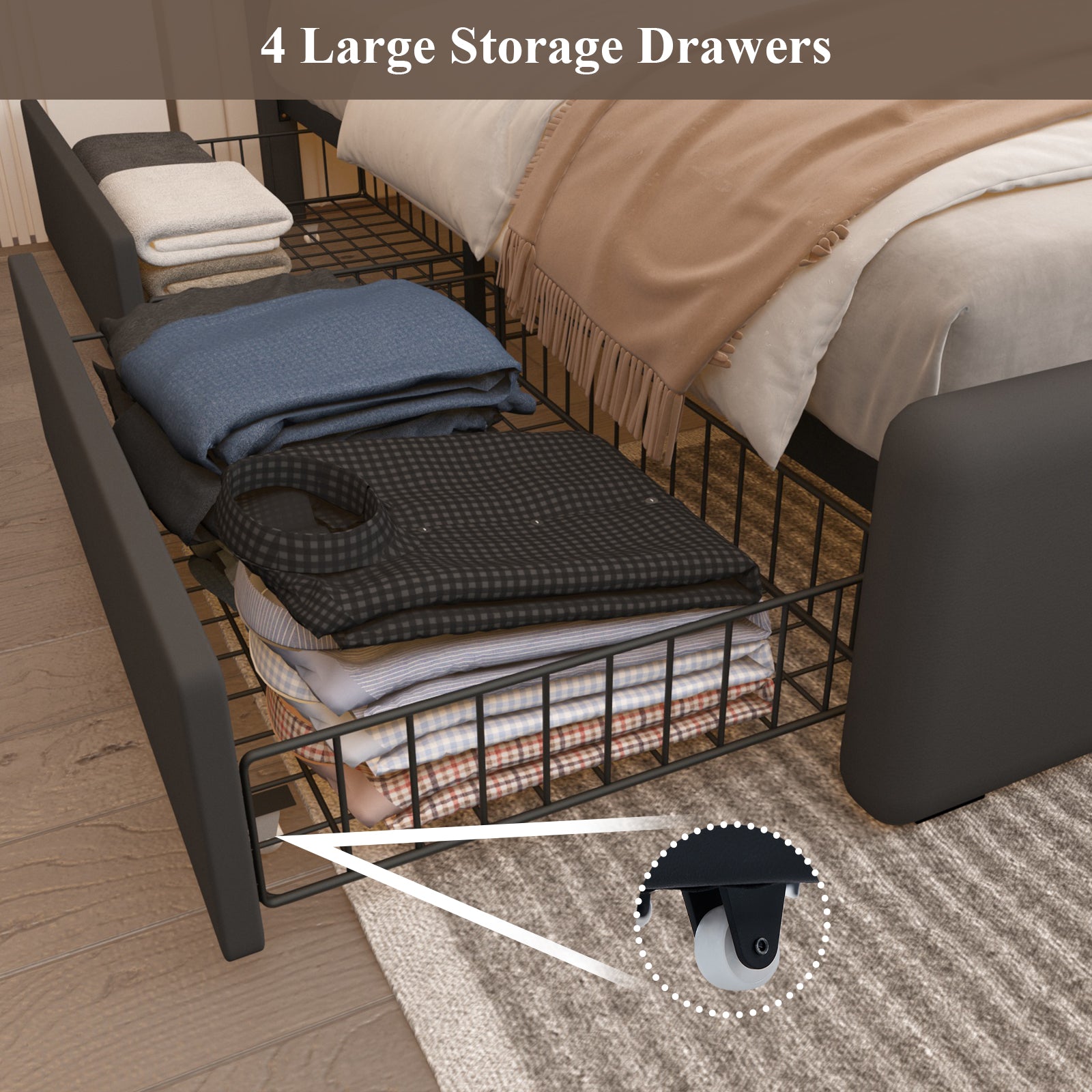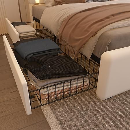 【Storage Splendor, 4 Opulent Drawers】 The LED bed frame is embellished with 4 capacious storage drawers beneath it. Each drawer is equipped with 4 silky-smooth wheels, facilitating effortless pulling out and closing.